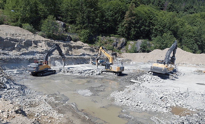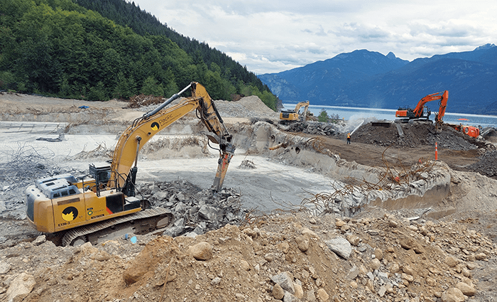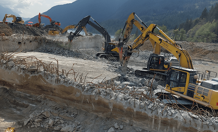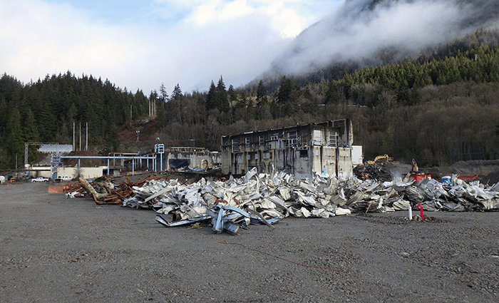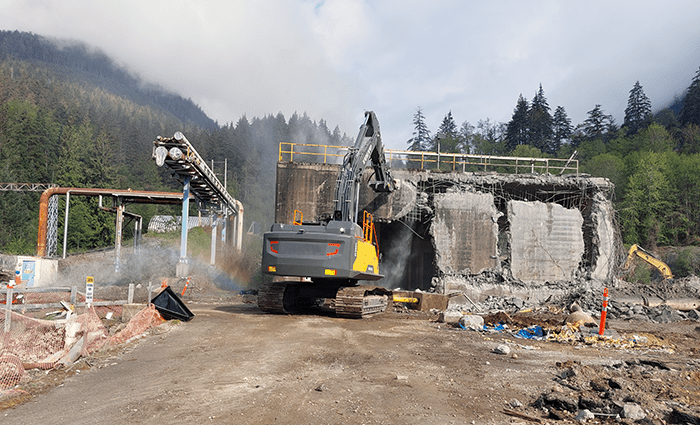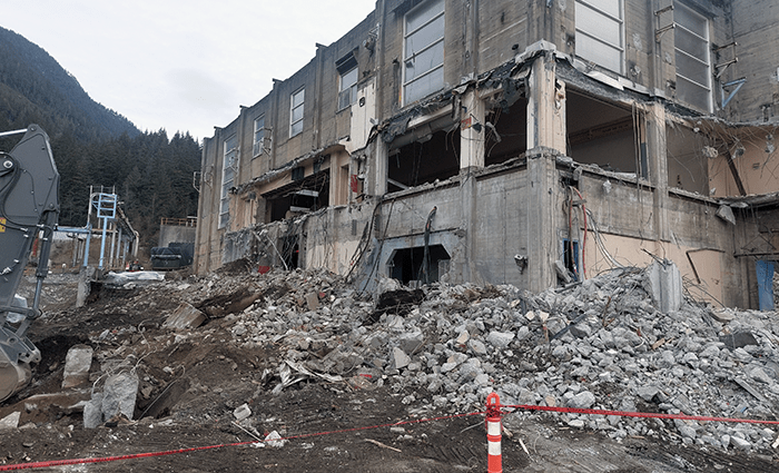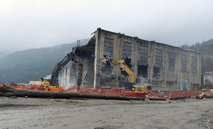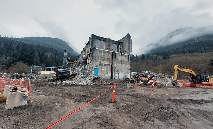 Pacific Demolition was contracted to demolish the above grade structures of a former pulp mill for the construction of a new LNG facility in Squamish, BC. This remote site required all equipment and demolition materials to travel by barge. Our scope of work included a powerplant and its warehouse, two bio-basin clarifiers and a chemical storage facility. All concrete was processed on site to be used for backfill in construction of the new LNG facility and all non-hazardous waste was recycled. Our crews coordinated activities in multiple locations daily on this isolated site and completed their work with no safety or environmental infractions.