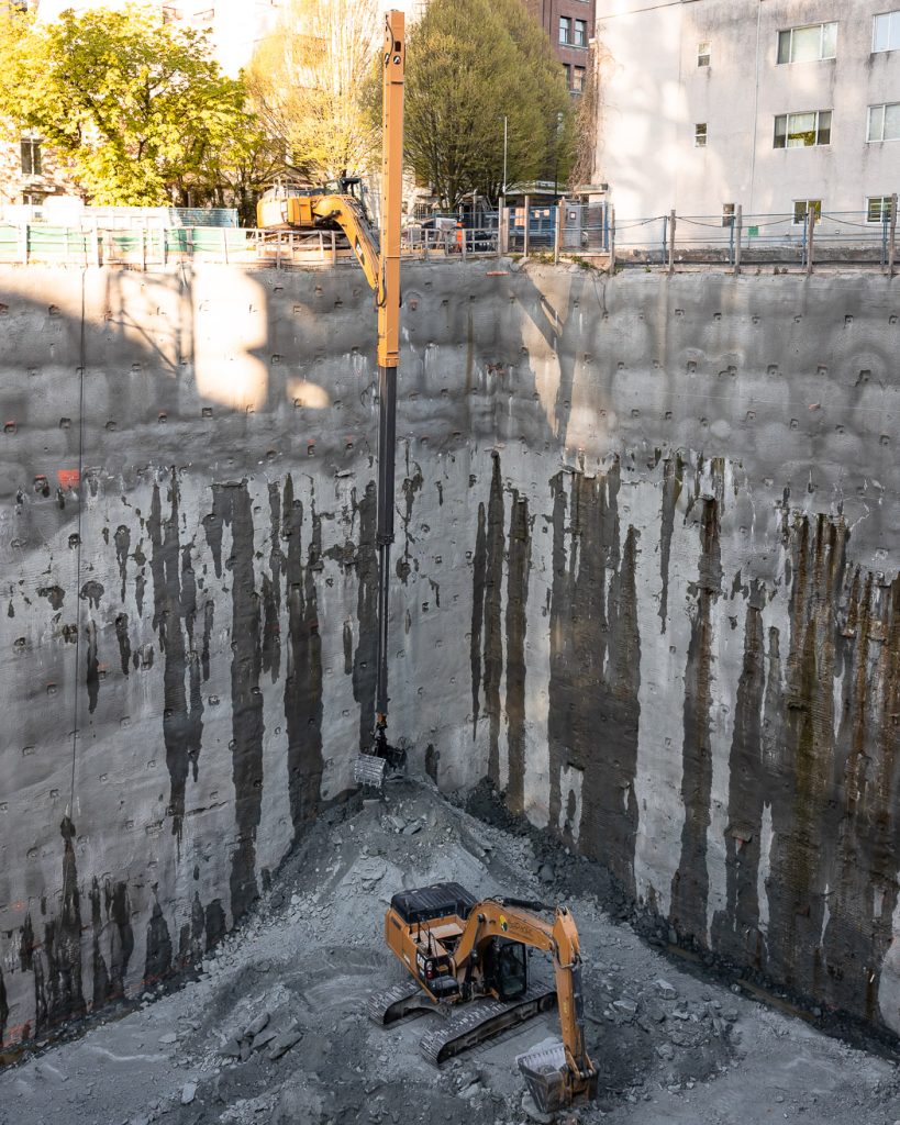 BelPacific Excavating and Shoring is working on the Butterfly Project for Westbank in Downtown Vancouver. This project requires excavation of over 100ft! To get the job done, NorLand brought in a Cat 336 equipped with a 100ft telescopic stick to remove material during the final stages of excavation.