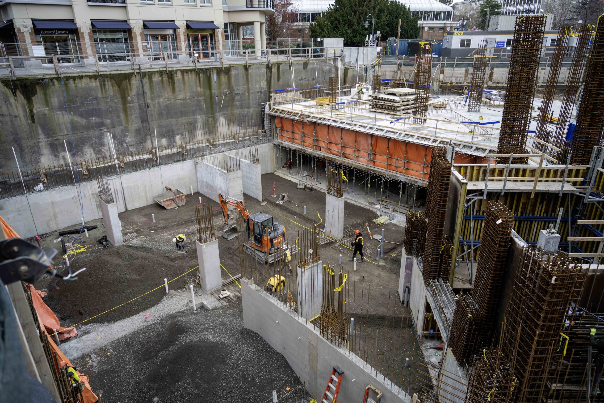 - Adjacent Building Support: Supporting the adjacent 12-storey Aria building during excavation without compromising its structural integrity. The integration of the Aria building’s existing underground parkade into the shoring system until the excavation depth required independent support, ensuring safety and stability.