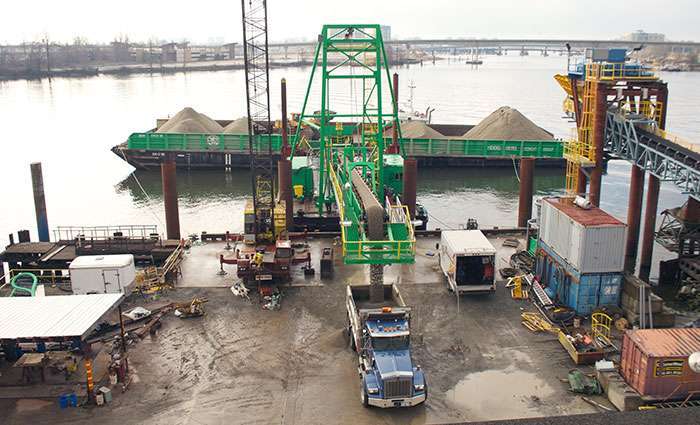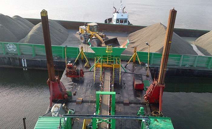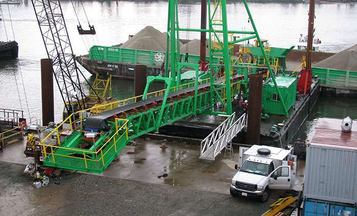 Lehigh Hanson Materials turned to LNS to design, build, install and commission a new conveying system on their Evco 100 barge to replace an outdated system. The newly designed system was integrated into existing equipment on the barge and reaches 60 feet beyond its bow. The new system operates at 800 tonnes per hour, including a 48-inch belt and drive system that provides the ability to raise and lower the conveyor.
