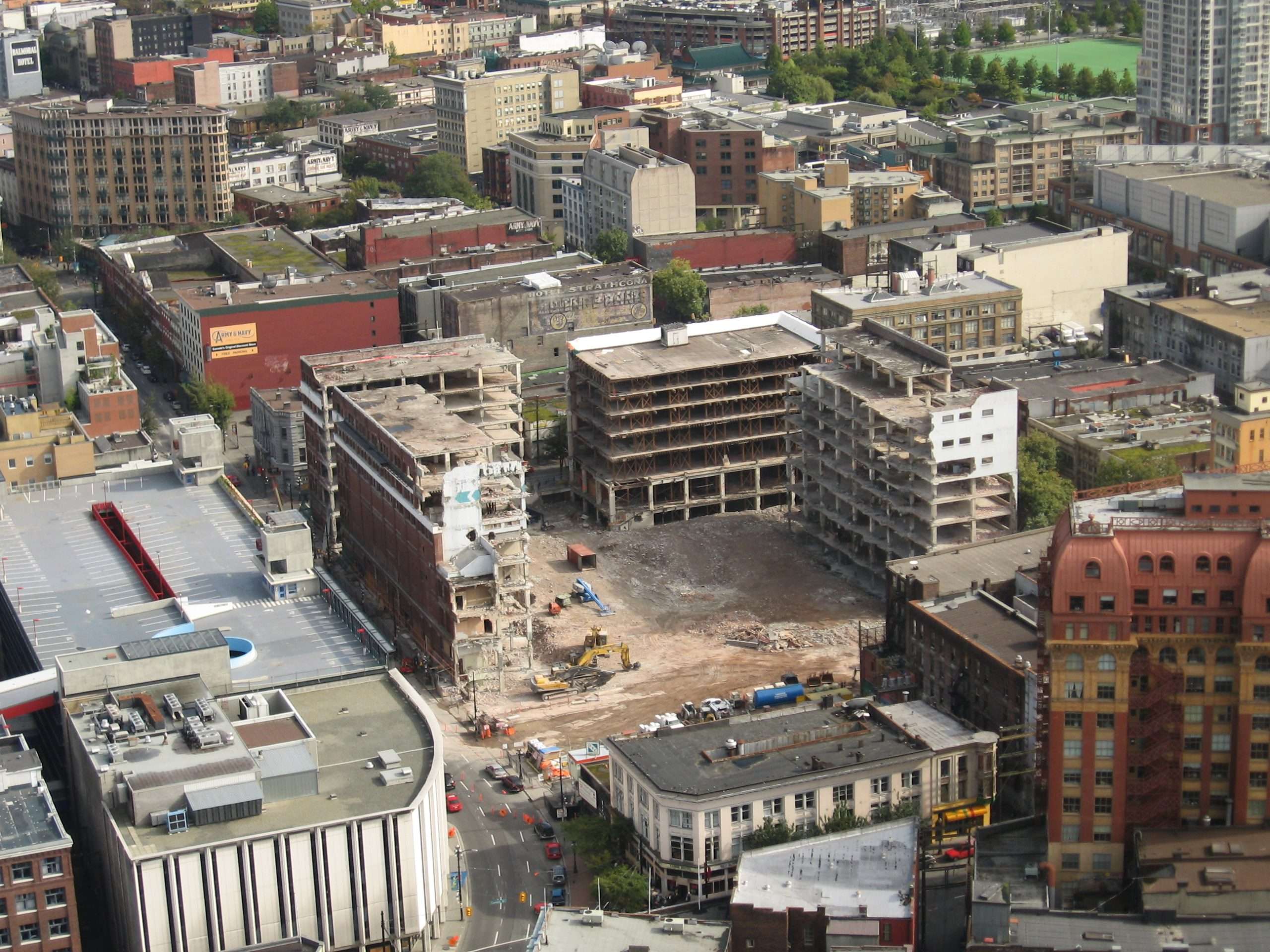 The Woodward Building at the corner of Hastings and Abbott Streets in Vancouver has been a historical landmark since its construction in 1903. The most noticeable feature that graced the skyline was a large revolving ‘W’ sign. The Woodward’s Department Store was the center of Vancouver’s retail district for many years and was the premiere shopping destination. The building expanded to handle warehousing and head office requirements and remained active until the Woodward Company filed for bankruptcy in 1993. The building sat vacant until 2006, when Pacific Blasting and Demolition Ltd. was contracted by ITC Construction to demolish most of the buildings, while maintaining the original 1903 wood structure. The site would be prepared for a new development that would restore the Woodward’s name and heritage, and revitalize the downtown eastside.