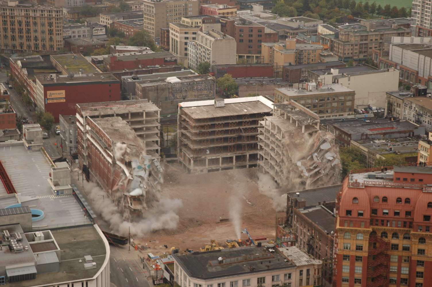 The famous revolving ‘W’ was also to be saved and be placed back on the new building. The ‘W’ sign was craned off the building, and the building was prepared for demolition’s greatest spectacle – Controlled Explosive Demolition. Extensive shoring was completed in the wood structure, and parts of the building were demolished conventionally to clear the way for the implosion.