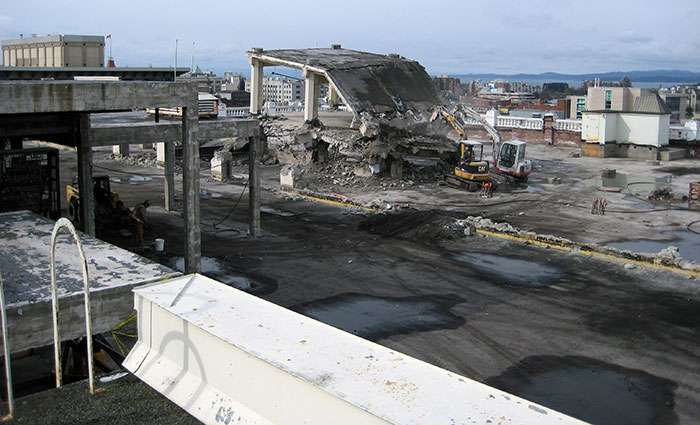 We were contracted to preserve the wall structure, decorative parapet and railing of one Victoria, BC’s oldest character buildings. Known locally as “The Hudson”, this building was converted into stunning loft apartments, penthouse suites and commercial space. Our crews used small excavators and bobcats, along with concrete saws and wiresaws to complete this extremely delicate roof and slab demolition project.