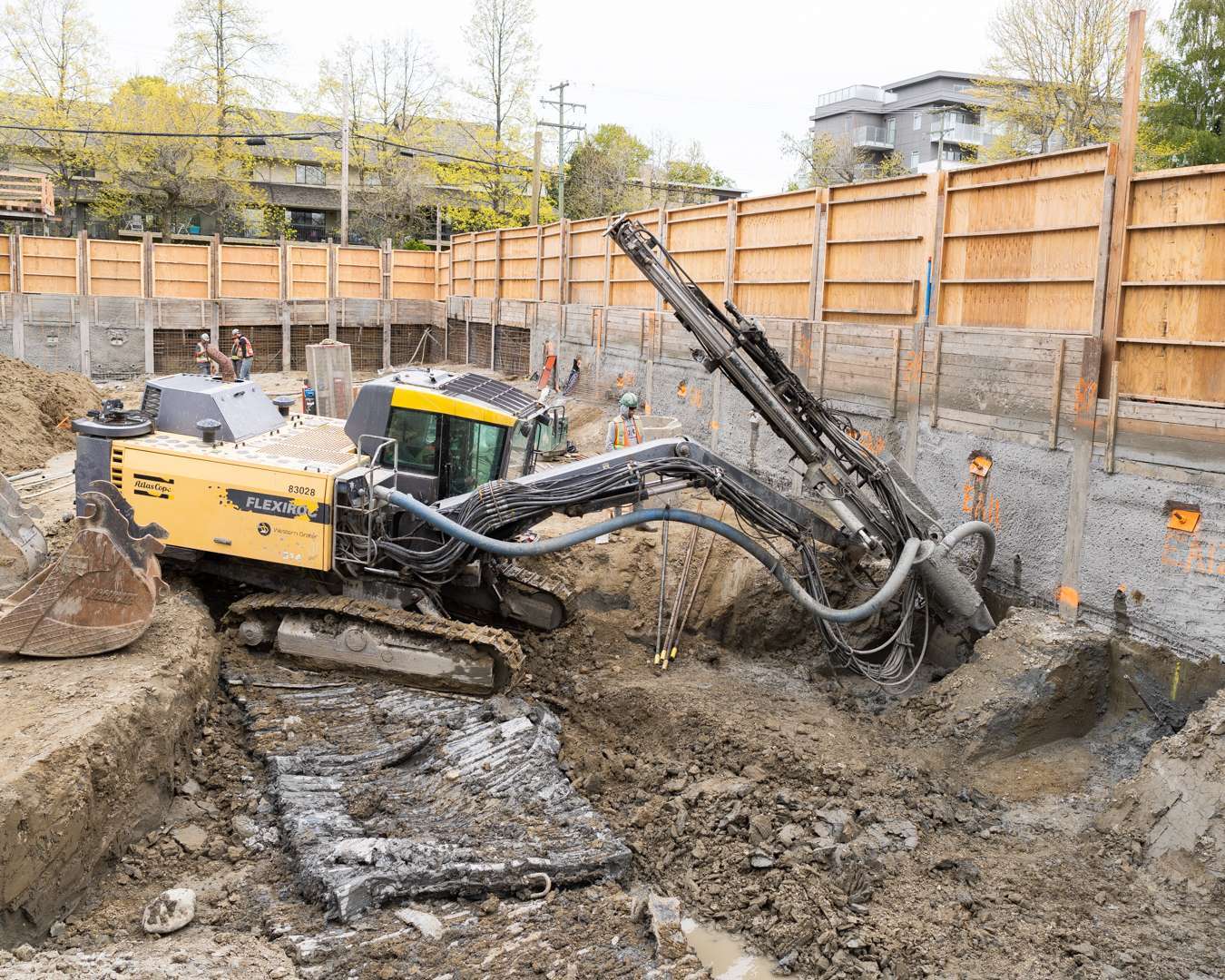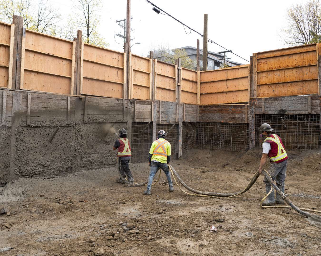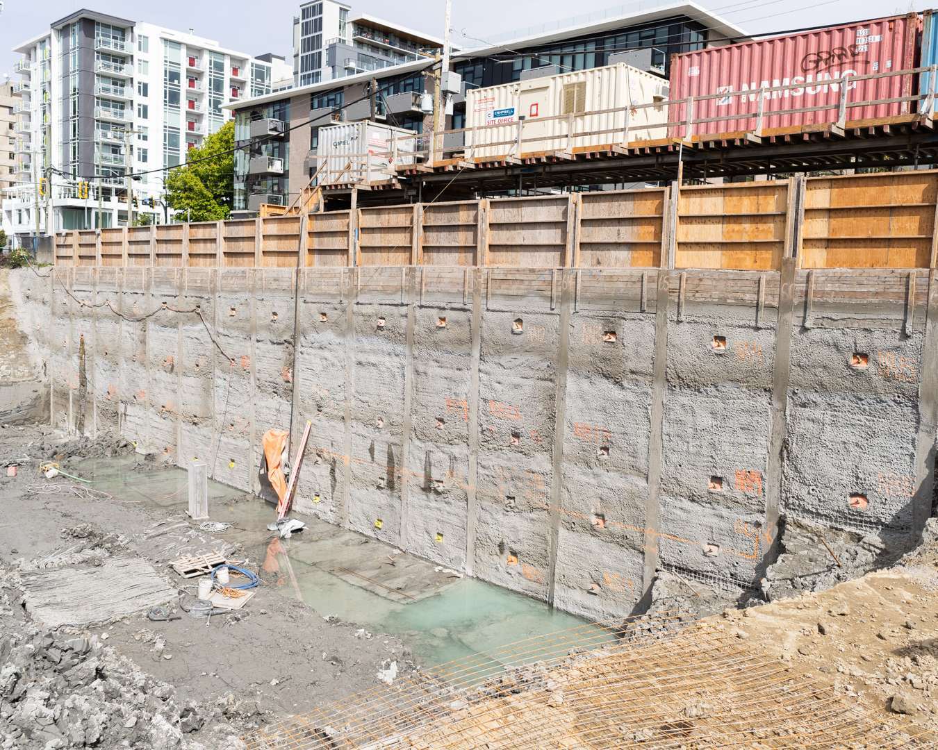 Cook Street Plaza (CSP) consisted of multiple scopes of work for Western Grater including shotcrete shoring and tie-back anchors as well as structural shotcrete. The shotcrete shoring consists of welded wire mesh and rebar to reinforce the shotcrete to create a stable vertical wall allowing developers to maximize land utilization. Tie-back anchors are drilled and grouted to further support shotcrete wall system. Western Grater utilizes an EVO anchor bar system which greatly improves efficiency over traditional drilling methods. Due to the depth of the excavation, H piles were also used to further stabilize the vertical shoring wall. The structural shotcrete aspect consists of traditional rebar reinforcement but lacks the need for traditional formwork, greatly increasing efficiency for the contractor.