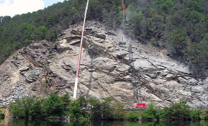 When a rock slide occurred on a popular stretch of highway in Tennessee known as “The Dragon’s Tail”, our crews were quickly mobilized to perform emergency rock slope stabilization services. In order to re-open the highway, popular for its 318 turns in just 11 miles, we efficiently completed scaling, meshing, trim blasting, rock bolting and rock excavation.