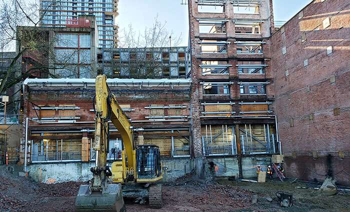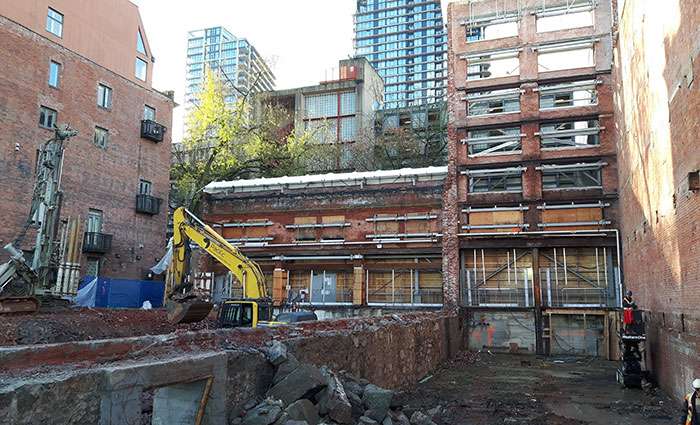 Pacific Demolition was contracted to demolish a heritage building in the heart of historic Gastown in Vancouver, BC, in a manner that allowed its façade to be preserved and incorporated into new construction.