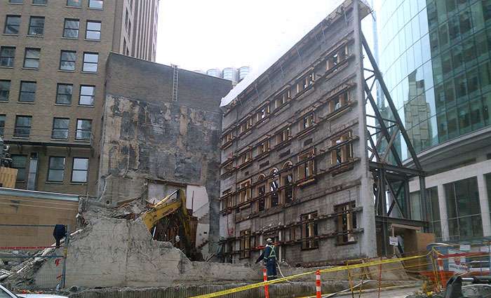 This challenging project involved preserving and supporting the facade of a 5-storey heritage building in the heart of downtown Vancouver, BC. During demolition, there could be no impact to any surrounding sidewalks, roads or businesses. With extensive planning and scheduling with other contractors, owners and surrounding businesses, the project was completed on time and on budget, and most importantly without incident. The facade support system allowed the construction contractor to excavate 80 ft. below street level during construction of the new building’s basement and parkade.