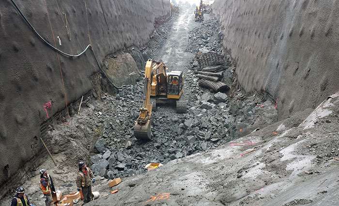 Being in close proximity to fish-bearing waterways and the local watershed, the use of environmentally friendly materials was a mandatory requirement of this project. Drilling was conducted with Atlas Copco D-7 hydraulic rock drills using environmentally friendly oils and lubricants. Blasting required the use of Unitronic 600 electronic detonators to ensure complete detonation of explosives and reliable, consistent vibration control. Western Grater successfully completed the contract as scheduled, allowing an underground tunneling contractor to promptly begin their scope of work.