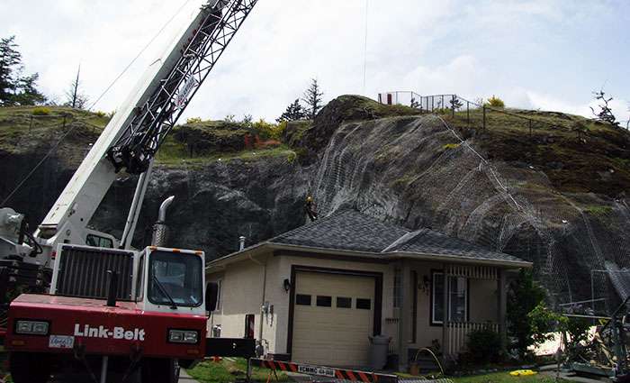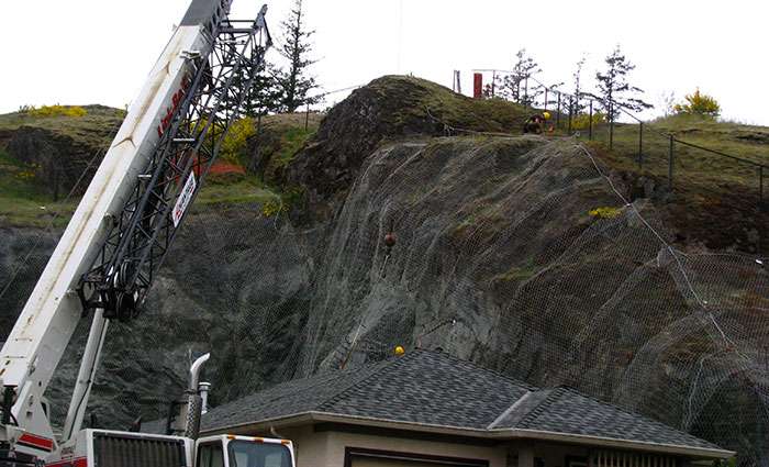 The City of Langford contracted Western Grater to install rock-fall hazard mitigation mesh and anchors on McCallum Rd. in Langford, BC. The work area was an unstable rock face within municipal parklands and overlooking a private residence. The rock face was a hazard to both the homeowner and the general public.