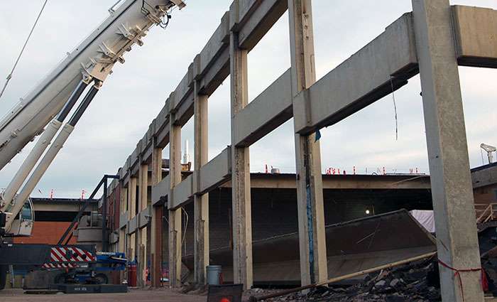 This project involved the removal of pre-cast exterior panels, concrete structural beams, building separations and slab cutting.