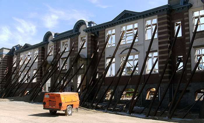 Originally constructed of concrete with stone wall foundations in 1911, additions in 1926 and 1941 were wood frame on concrete foundations. The exterior walls consisted of red brick, which provided support for the floor joists as well as the steep pitched wood frame roof. Extensive excavation preceded temporary shoring of all floors and the roof, strategic building separation, and subsequent installation of structural shotcrete foundations and walls.
