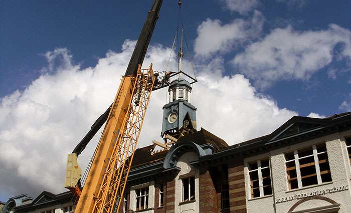 With the District striving to meet LEED certification, 82% of all demolition waste was diverted from local landfills. Many of the building components were hand-salvaged for future re-use in construction of the new school, including 3×14 fir joists, hardwood flooring, bricks, and decorative granite stones. Most notably was the cupola / clock tower, which was lifted by crane in one piece off the building, refurbished on site, and eventually re-instated in it’s original location above the front entrance.
