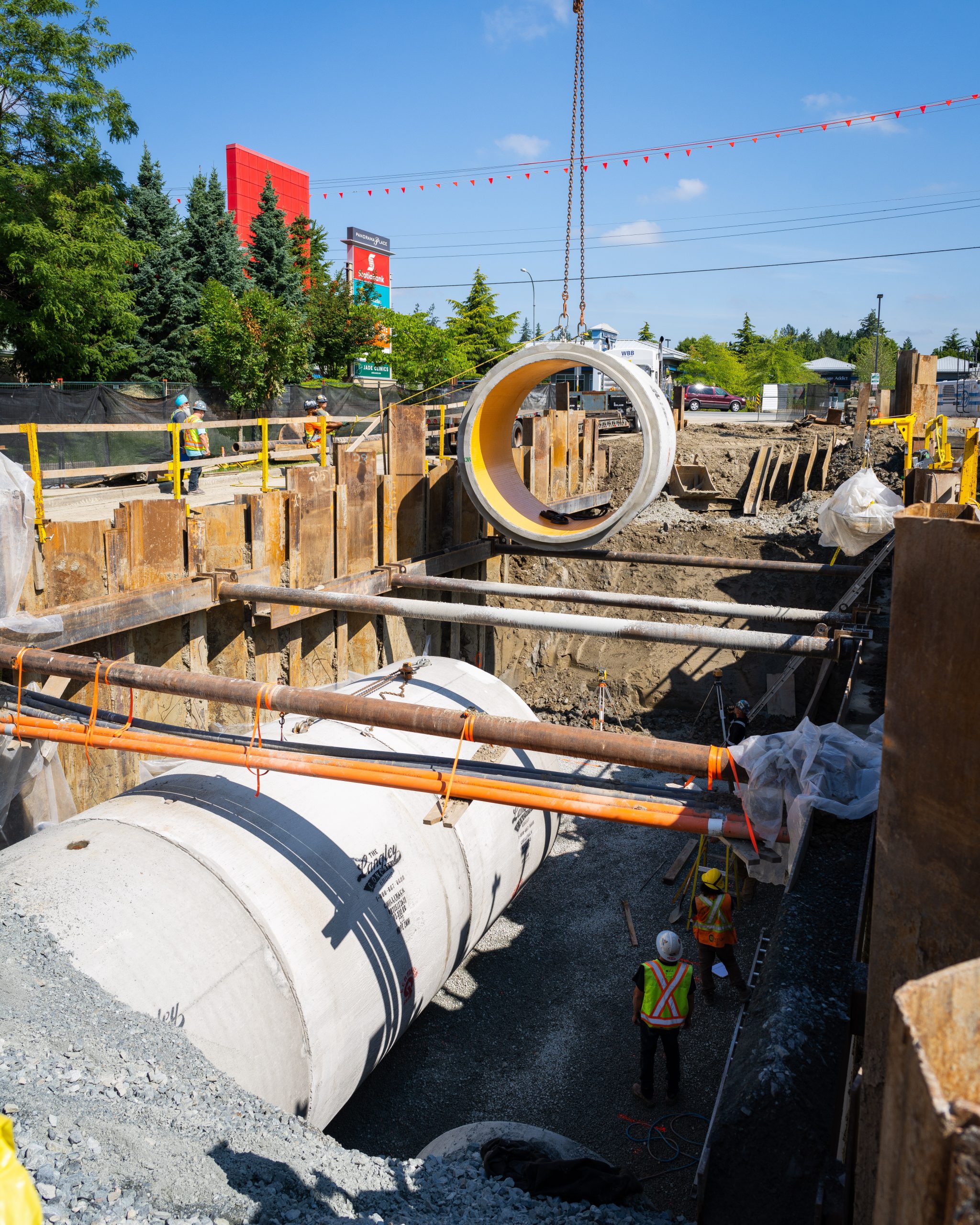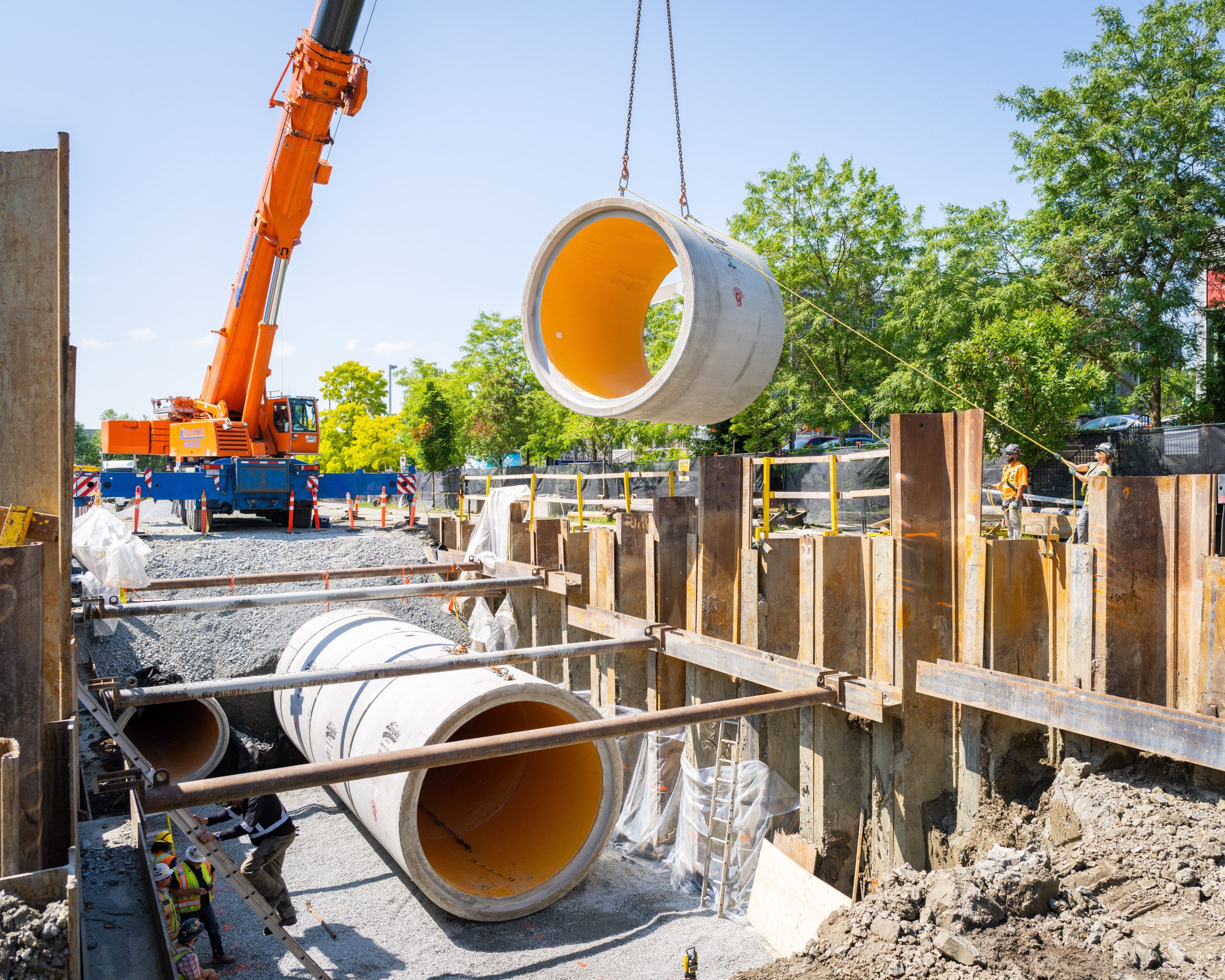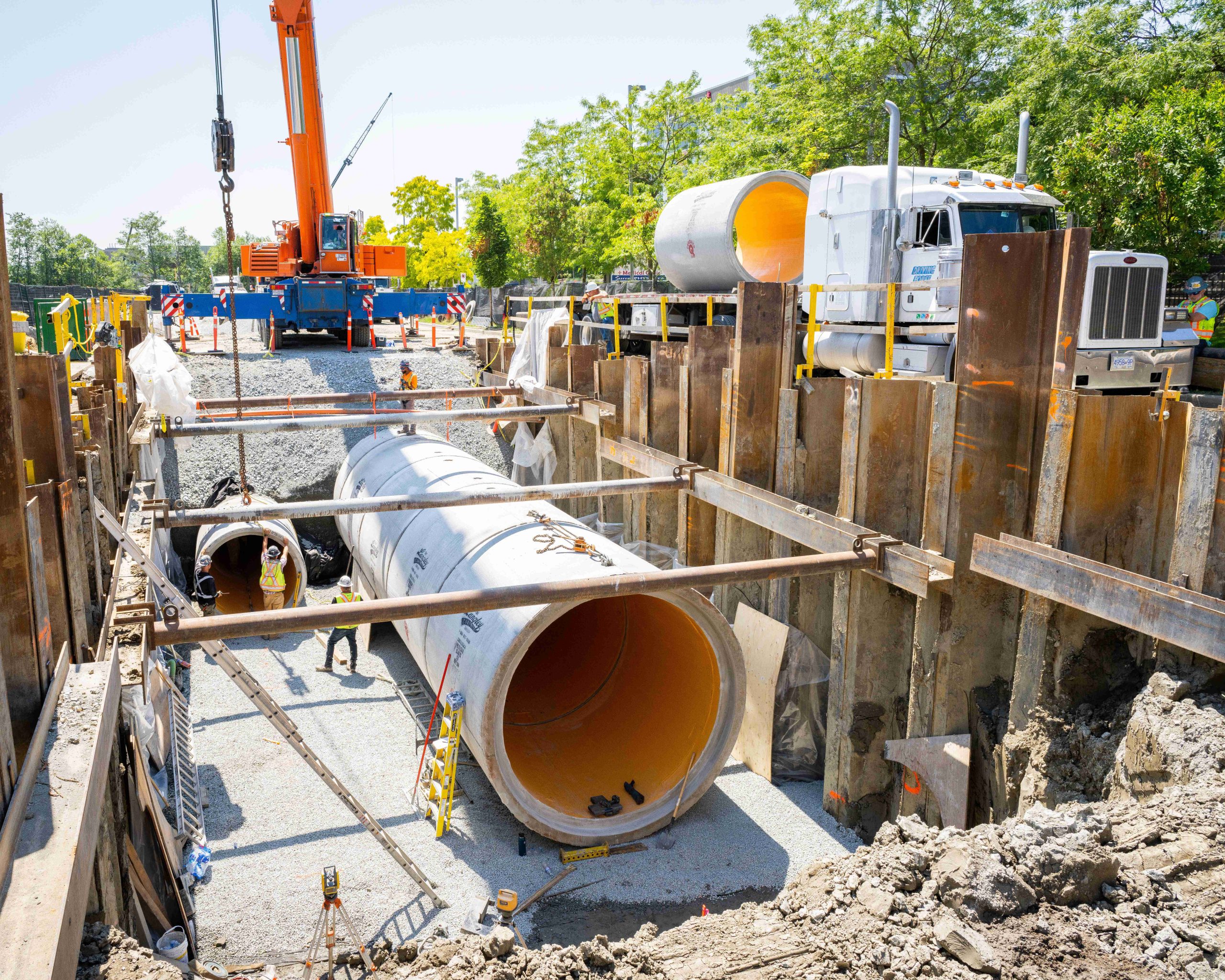 The scope of the project consisted of the installation of approximately 52 m of reinforced concrete box sections,117 m of 3,048 mm ID reinforced PVC lined concrete pipe; and 162 m of 1,829 mm ID reinforced concrete pipe, full restoration of 153a Street and electrical works associated with flow control. Given the restrictive and highly trafficked urban setting, work was completed within the 14 m wide work zone, utilizing a 270-ton crane to install the pipe sections and detailed planning for the 7,000 cubic meter excavation and 6 m deep shoring of the trench as described below.