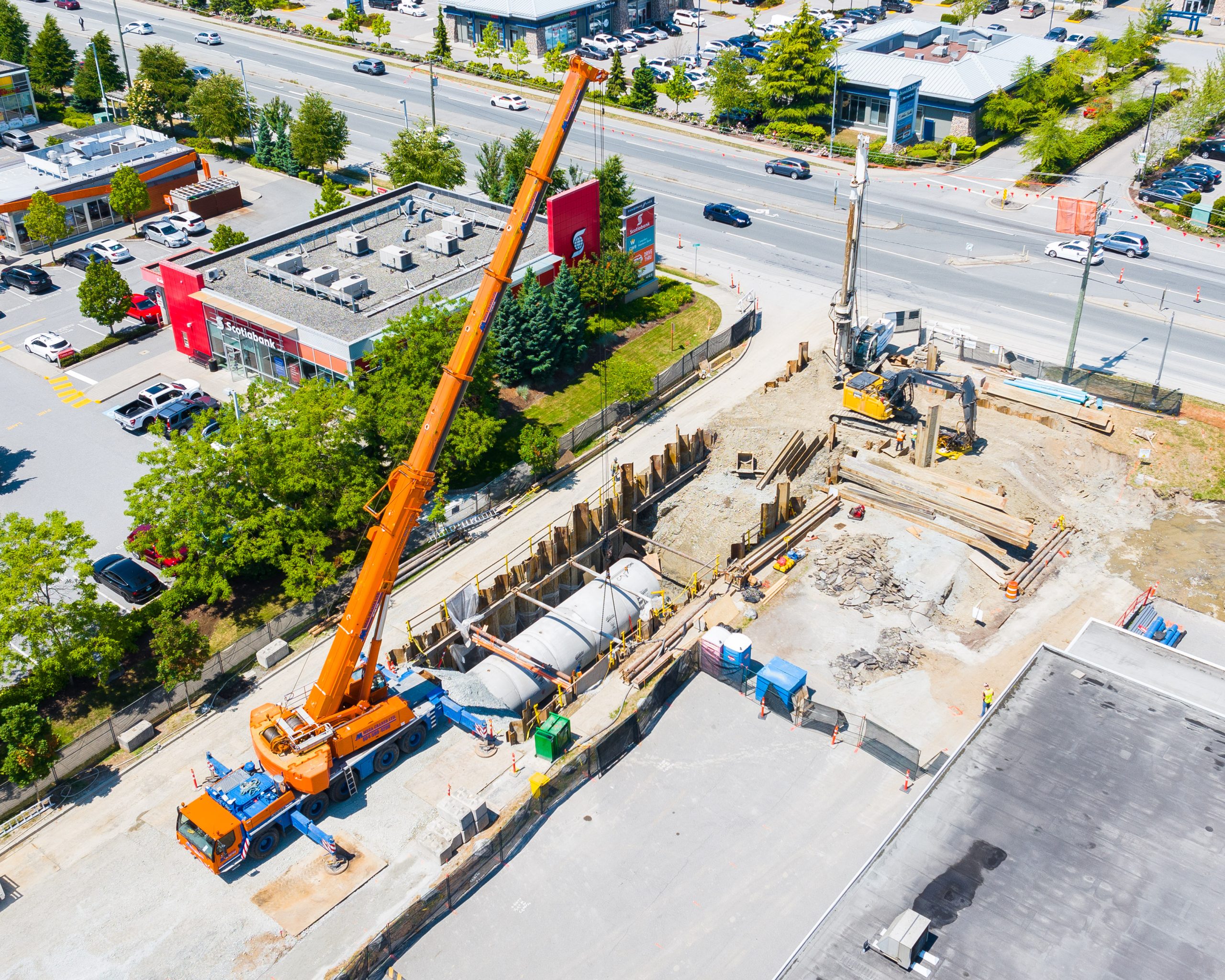 The excavation was shored open cut, utilizing 6 m length H-Pile beams, and steel sheet pile. This portion of the work was designed by BEL’s shoring subcontractor including all engineering signoff. The shoring was installed in 30-meter sections before the excavation commenced. Additionally, given the urban setting of the project, a number of underground and overhead utilities were encountered. Utility crossing supports and shoring modifications were designed and implemented to maintain the utilities and ensure the local businesses had no interruption.