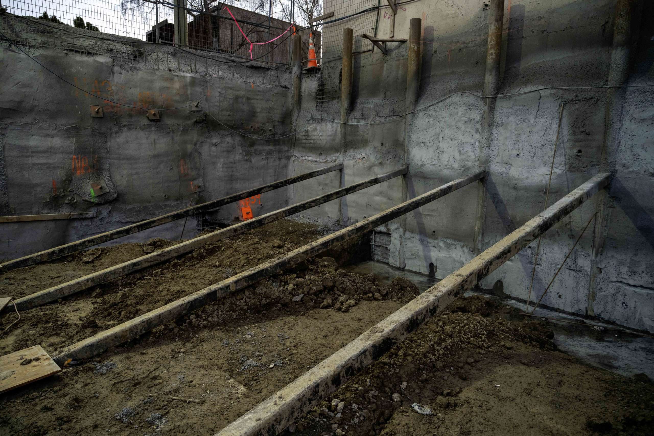 A unique challenge to this project was the internally braced portion of the excavation, due to the lack of encroachment agreements with a neighbouring property, traditional shoring methods were not possible. The solution to this problem was to drill 8-inch pipe piles installed at 1.8m intervals along the property line, with steel brace beams attached back to a Deadman footing. Western Grater has done similar internal bracing systems in the past, but each design comes with its own unique challenges.