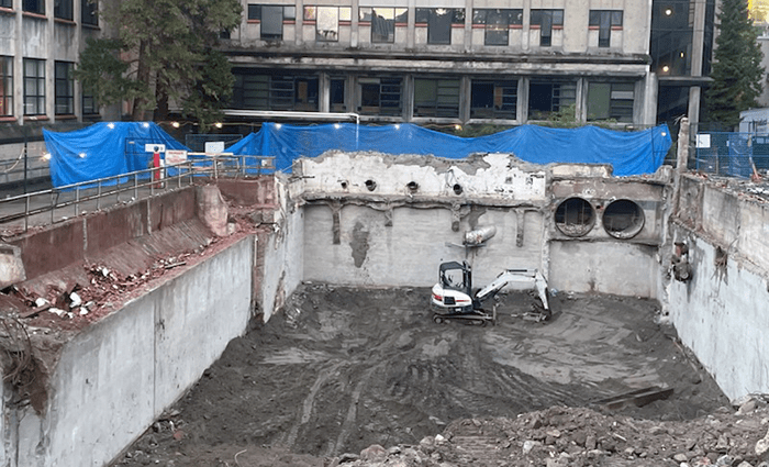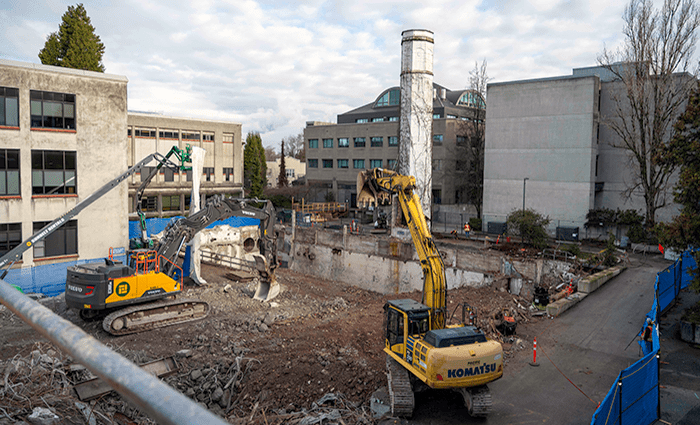 Pacific Demolition was contracted to complete the abatement and demolition of UBC’s 1930’s era powerhouse while the university remained in full operation. Our crews used engineered demolition plans to carefully deconstruct the building, its five boilers, equipment, and a 75’ vertical stack in a manner and sequence that minimized dust, noise and vibration impacts to the surrounding area. We also backfilled the void after the building was demolished. A combination of high-reach and conventional excavators were used to complete the project safely and efficiently with no disruptions to students, faculty and university operations. All non-hazardous waste was recycled at licensed facilities.